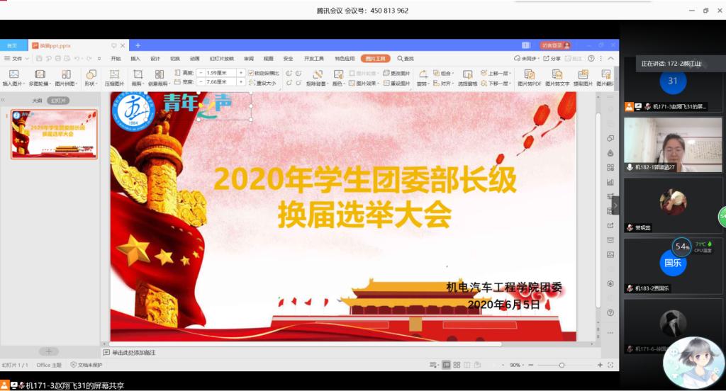 于6月5日通过腾讯会议举行学生团委线上换届活动,团委老师曲季、团委副书记赵翔飞、各部门部长以及所有竞选人员参加了此次会议。