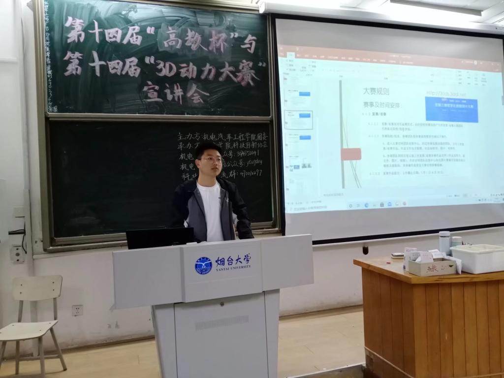 于第五教学楼205室举办“高教杯”全国大学生先进成图技术与产品信息建模创新大赛、全国三维数字化创新设计大赛宣讲会。徐一帆、张晓伟等优秀参赛学子以及二百余名机电学子参与其中。