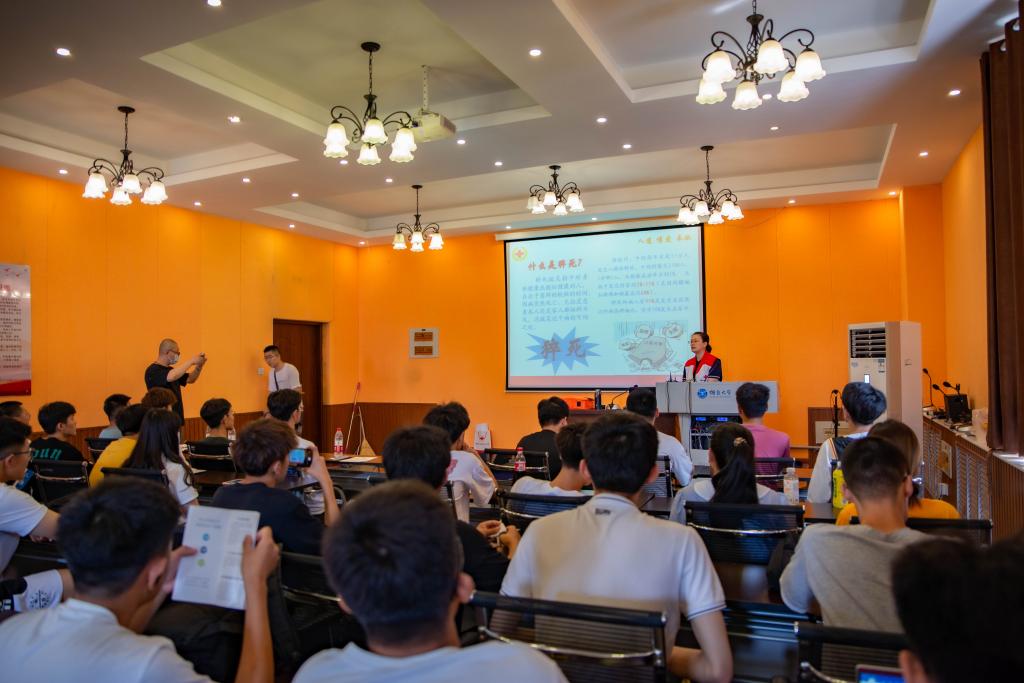 胡芳首先从红十字文化开始讲解,同时通过视频的方式向在场师生展示了真实案例,通过最直观的方式提高同学们的重视程度。在应急救护培训环节,她用通俗易懂的语言,结合真实案例和模拟人现场演示,采用理论知识讲解和实际操作相结合的方式,详细讲解了心肺复苏术、AED急救设备的使用和海姆立克急救法三项内容。在讲解过程中,胡芳强调,急救最关键的一点就是急救方式的正确使用,尤其是要注意婴儿急救与成人急救方式上的不同。