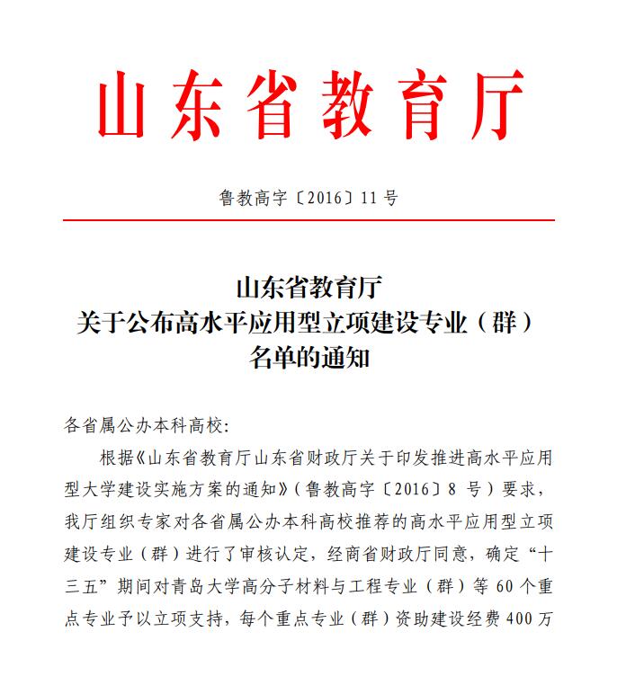 以机械设计制造及其自动化专业为核心的专业群于2016年获批山东省高水平应用型立项建设专业(群)